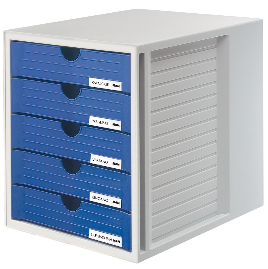Suport plastic cu 5 sertare pentru documente, HAN – gri deschis – sertare albastre